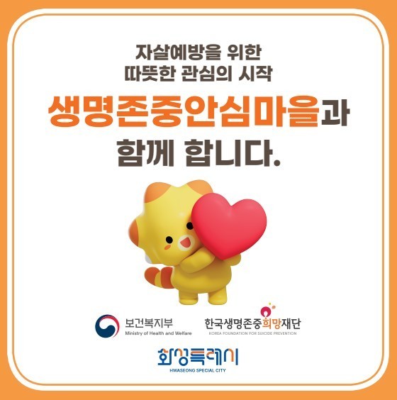 사업 참여 기관‧단체에는 ‘생명 존중 안심마을’ 현판이 제공되며, 우수 활동 기관에는 표창 등 인센티브도 지원할 예정이다. 참여를 희망하는 기관‧단체는 만세구보건소 자살예방팀(031-5189-7156) 또는 화성시자살예방센터(031-352-0175)로 문의하면 된다.