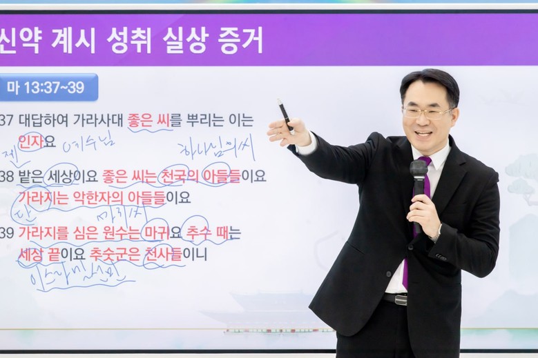 19일 신천지 전주교회에서 ‘계시실상 성취 증거’를 주제로 최중일 지파장이 강연하고 있다.