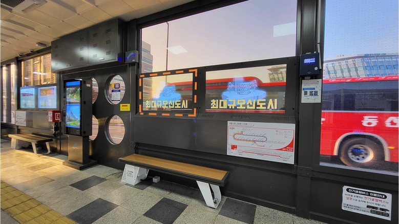 특히 투명 OLED의 장점인 40% 투과율을 활용해 창밖으로 보이는 실물 배경과 디지털 정보를 동시에 볼 수 있다. 이를 통해 공간의 개방감은 유지하면서 시민들에게 색다른 콘텐츠 경험을 제공한다. 또한, 위치정보와 공공데이터를 연계해 안전 및 긴급상황 정보를 시민들에게 알려준다.