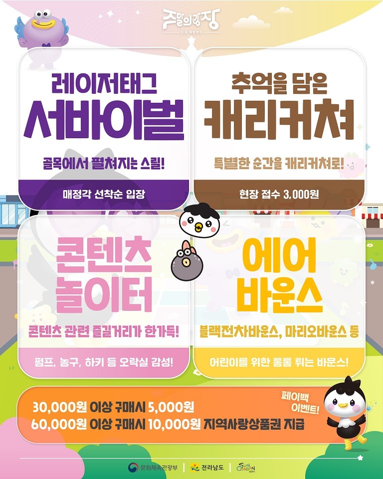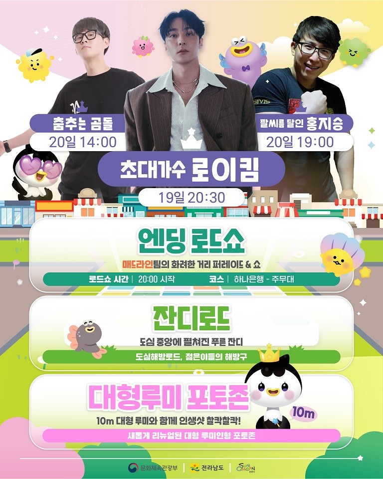 주말의 광장 트레이드마크는 단연 ‘잔디로드’로, 평범한 연향동 거리를 싱그러운 초록빛 휴식 공간으로 탈바꿈한다. 여기에 순천시 대표 캐릭터 루미의 10M 대형 조형물과 포토존이 더해져, SNS 핫플레이스가 탄생할 것으로 기대된다.
