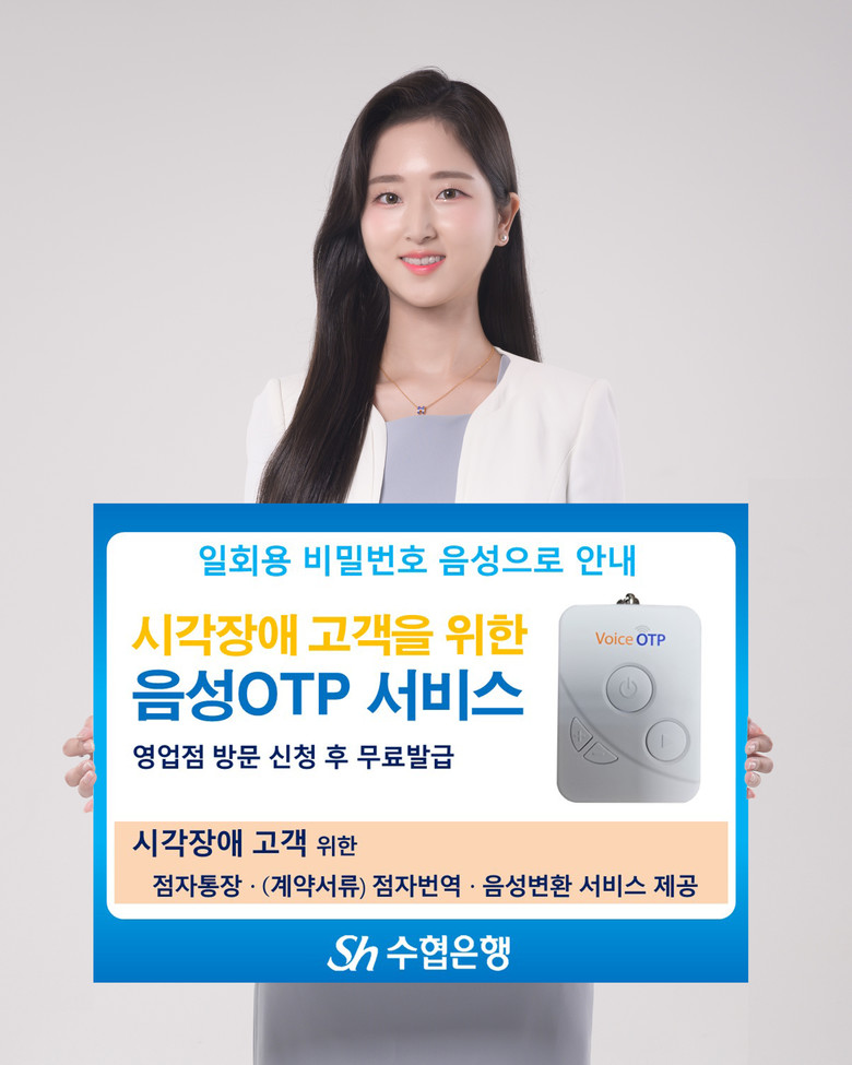 Sh수협은행은 이의 일환으로 ‘시각장애인을 위한 음성 기반 일회용 비밀번호 발생기(Voice OTP, 이하 “음성OTP”)’ 서비스를 도입하고 시각장애 고객을 위한 맞춤형 지원을 제공한다.