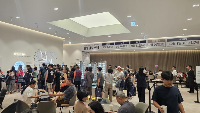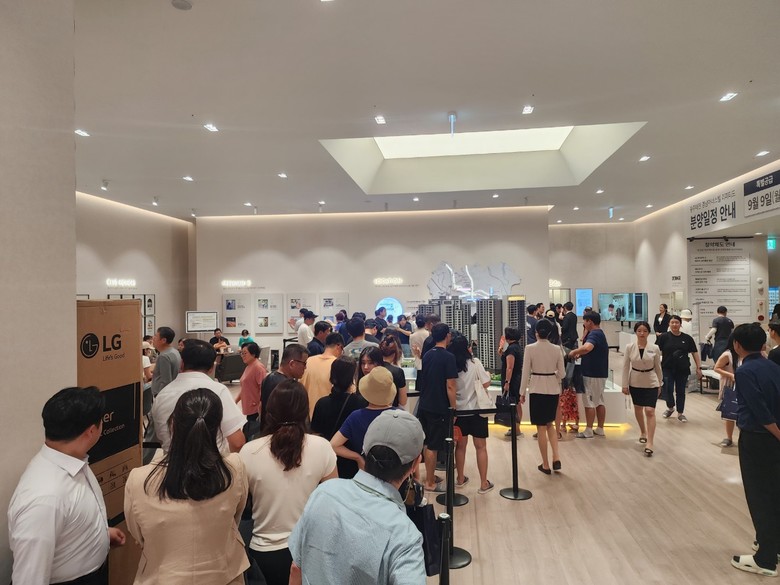실제 견본주택 앞은 무더운 날씨에도 불구하고 입장을 기다리는 방문객들로 긴 대기행렬이 이어졌고, 내부에 마련된 상담석은 남녀노소 다양한 연령층의 상담객들로 가득 찼다. 모형도와 유니트 앞 역시 관람객들로 문전성시를 이루는 모습이다.