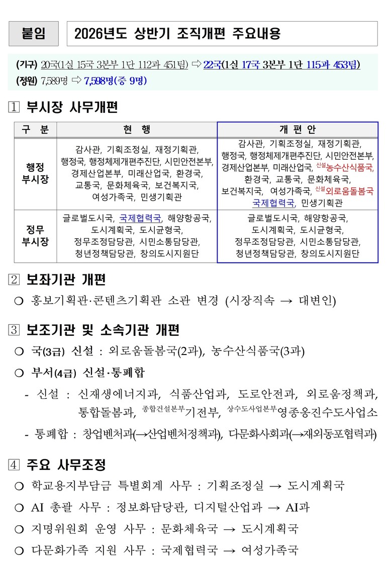 이번 조직개편은 사회적 고립과 외로움 문제에 대응하기 위한 전담 조직인 ‘외로움돌봄국’을 신설하고, 농·축·수산업을 아우르는 ‘농수산식품국’을 새롭게 구성하는 등 시민 행복 정책과 지역 경제 경쟁력 강화를 핵심 목표로 추진된다.