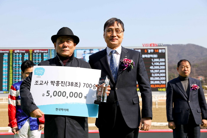 이번 수상 대상자는 박흥진 조교사(61)와 신형철 기수(50)로 500만원의 포상금과 기념패를 전달받았다. 박흥진 조교사는 작년 12월 23일 제5경주, 신형철 기수는 2월 25일 제5경주를 우승하며 700승의 고지를 밟았다.