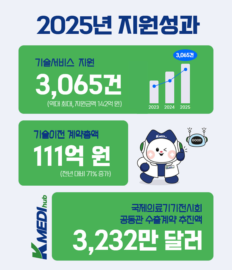 K-MEDI hub는 작년 한 해 동안 기술서비스 지원건수와 금액을 각 3,065건, 142억 원 달성했다. 특히, 지원금액은 전년 대비 13% 증가해 기업 맞춤형 지원체계 구축과 고난도 기술지원 역량 강화 노력이 빛을 발했다.