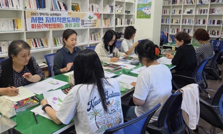 | ▲ 지역 주민들이 서면작은도서관에서 열린 _찾아가는 농촌배움터_ 프로그램의 색연필화 수업에 참여하고 있다 |