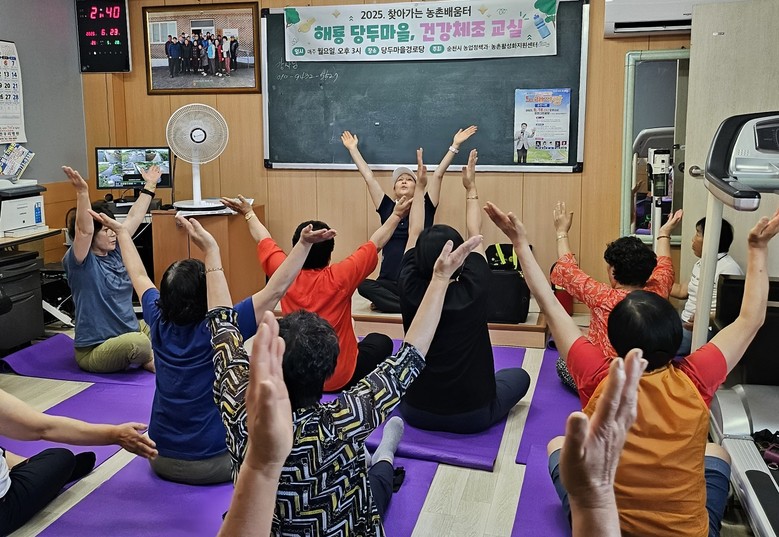 | ▲ 해룡당두 마을 주민들이 ‘찾아가는 농촌배움터’ 프로그램의 건강체조 수업에 참여하고 있다 |