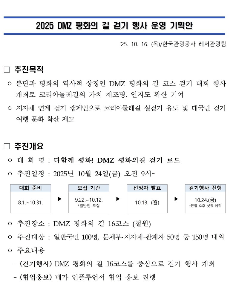 한편, 철원군은 올해 3월부터 12월까지 매주 목·토요일, 주 2회 사전예약제 걷기 프로그램을 운영하고 있다.