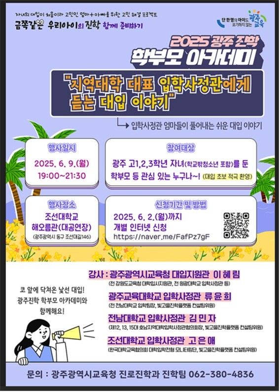 참가를 희망하는 학부모는 오는 6월 2일까지 시교육청 진로진학지원센터(https://jinhak.gen.go.kr/)를 통해 온라인 사전 신청을 하면 된다. 당일 현장 접수도 가능하다.