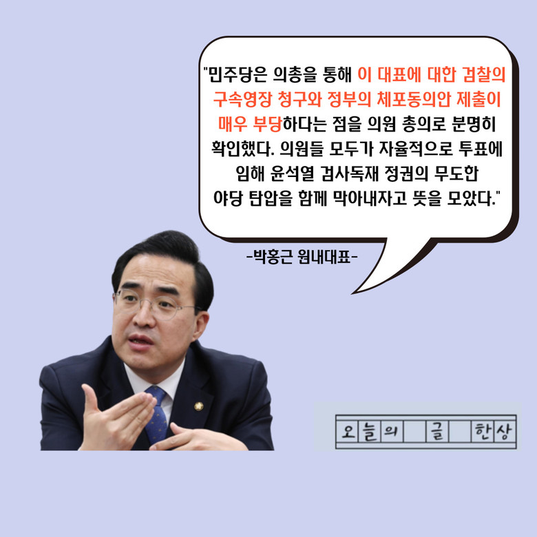 이에 박홍근 원내대표는 21일(화) "이 대표에 대한 검찰의 구속영장 청구와 정부의 체포동의안 제출은 너무나도 부당하다는 점을 의원 총의로 분명히 확인했다. 체포동의안 처리에 관한 당론 채택 여부는 논의조차 할 필요가 없는 사안이라 판단됐다" 고 말했다. 이에 "의원들 모두가 자율적으로 투표에 임해 윤석열 검사독재 정권의 무도한 야당 탄압을 함께 막아내자고 뜻을 모았다"고 의지를 밝혔다.