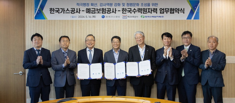 [세계타임즈 = 이영진 기자] 한국가스공사(사장 최연혜)는 5월 16일 서울 중구 스마트워크센터에서 한국수력원자력(사장 황주호), 예금보험공사(사장 유재훈)와 ‘적극행정 확산, 감사 역량 강화 및 청렴문화 조성을 위한 업무협약’을 체결했다고 17일 밝혔다.