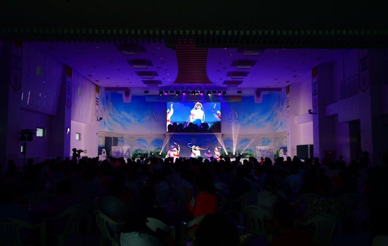 19일 신천지예수교 전주교회에서 참석자가 공연을 관람하고 있다.