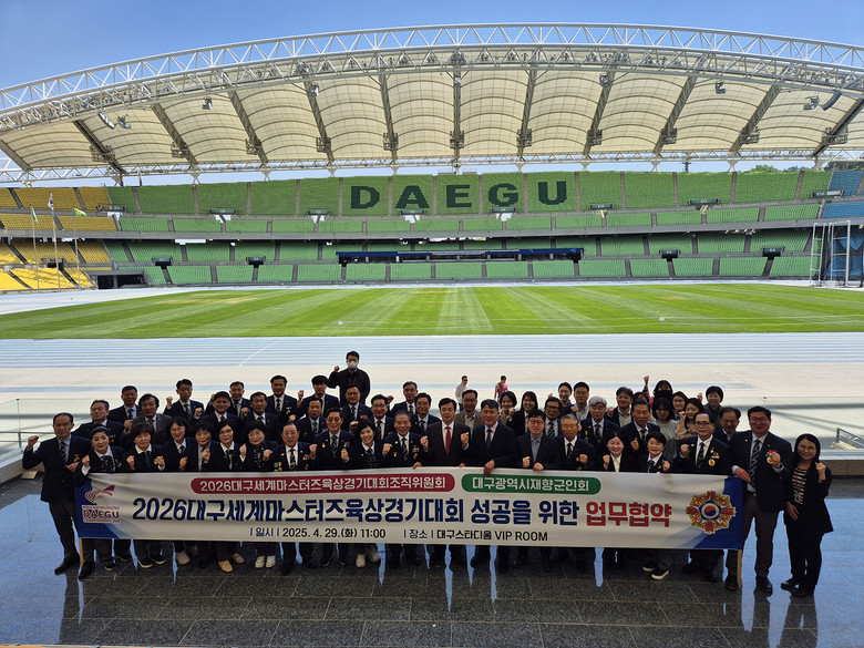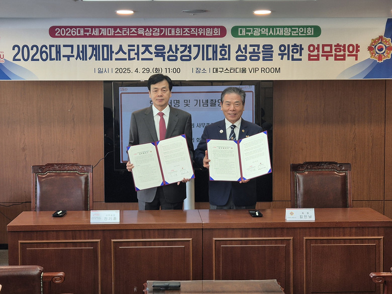 2026대구세계마스터즈육상경기대회 조직위원회(사무총장 진기훈)와 대구광역시 재향군인회(회장 김인남)는 4월 29일(화) 오전 11시 대구스타디움에서 업무협약(MOU)을 체결하고, 대회의 원활한 운영과 성공적 개최를 위한 다각적인 협력에 나선다.
