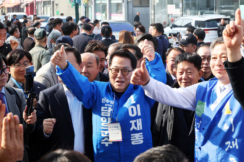 [담양 세계타임즈 = 심귀영 기자] 더불어민주당 박지원 의원이 22일 오전 전남 담양군 중앙공원 사거리에서 이재종 후보 지원 유세를 하고 있다. 2025.3.22