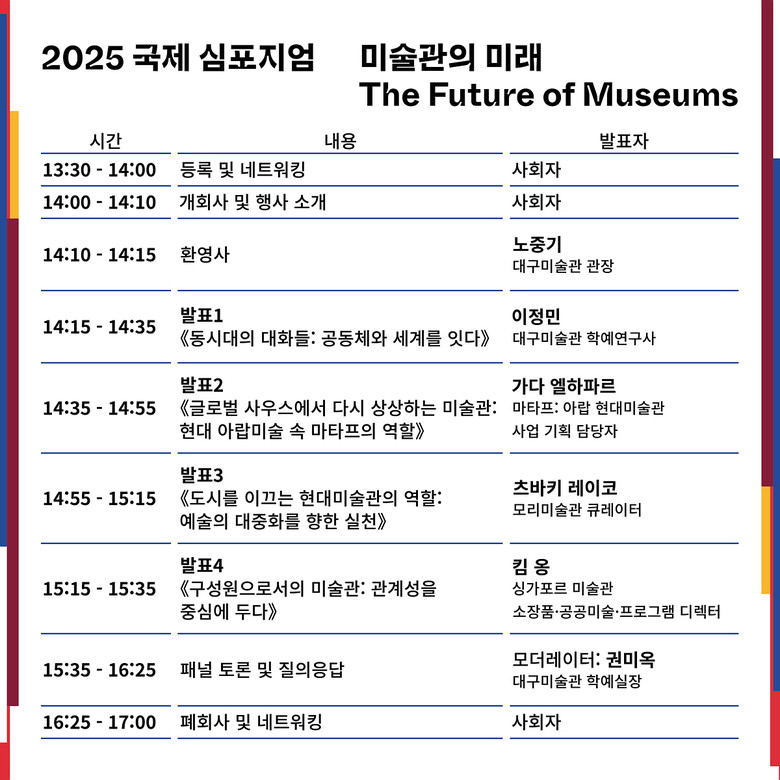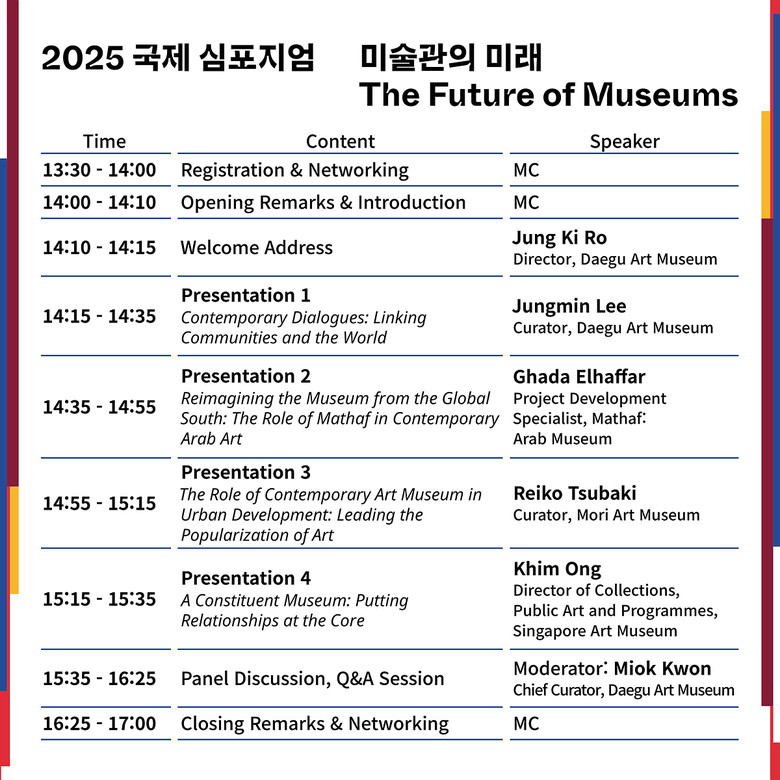 프로그램은 이정민 대구미술관 학예연구사의 발표 ‘동시대의 대화들: 공동체와 세계를 잇다’를 시작으로, 제이나 아리다 관장의 ‘글로벌 사우스에서 다시 상상하는 미술관: 현대 아랍미술 속 마타프의 역할’, 츠바키 레이코 큐레이터의 ‘도시를 이끄는 현대미술관의 역할: 예술의 대중화를 향한 실천’, 킴 옹 디렉터의 ‘구성원으로서의 미술관: 관계성을 중심에 두다’ 등 네 가지 발표가 이어진다.