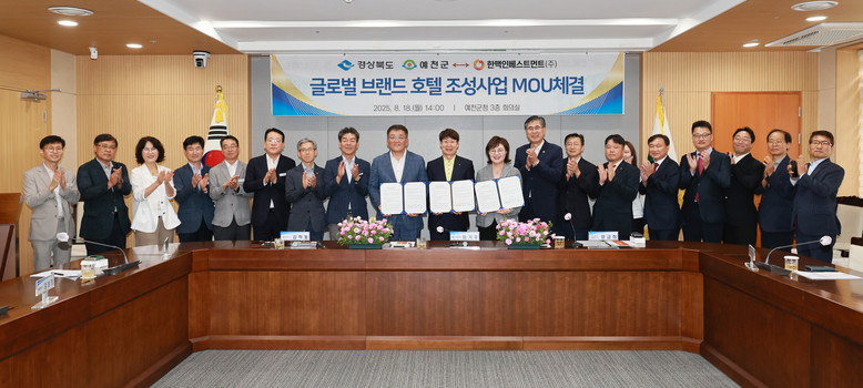 - 한맥인베스트먼트(주) 약 1,000억원의 과감한 투자로 지역경제 활성화 견인 - [세계타임즈=경북 한윤석 기자] 경상북도와 예천군은 18일 예천군청에서 한맥인베스트먼트(주)와 ‘글로벌 브랜드호텔 조성 사업’의 추진을 위한 투자양해각서(MOU)를 체결했다.