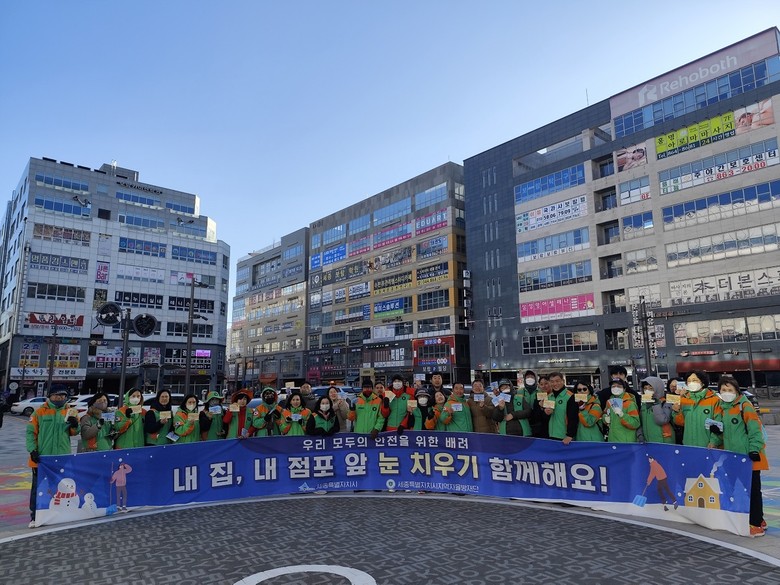 이날 참여자들은 상가와 학원 등에서 눈에 잘 띄는 곳에 부착한 뒤 실천을 되새길 수 있도록 ‘내 집·내 점포 앞 눈 치우기에 동참하겠습니다’라고 적힌 홍보 엽서를 배부했다.