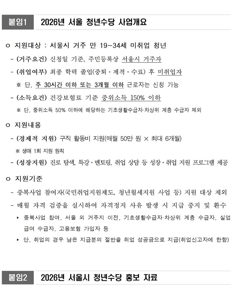 서울시는 3.6.(금) 오전 10시부터 3.13.(금) 오후 4시까지 ‘2026년 서울 청년수당’ 참여자 2만 명을 모집한다고 밝혔다. ‘청년몽땅정보통(youth.seoul.go.kr)’ 누리집을 통해 신청할 수 있으며, 선정된 청년에게는 월 50만 원씩 최대 6개월간 수당이 지급된다.