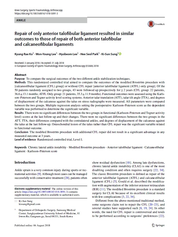 이원영 원장은 “해당 연구를 통해 발목 불안정성 환자 수술 시 일반적으로 시행되는 추가적인 인대 봉합술을 시행하지 않고도 좋은 임상 결과 얻을 수 있어 수술 환자들의 부담을 크게 줄일 수 있었다는 점에 의미가 크다. 또한 재활 과정에 대한 해당 연구 결과가 수술 이후 환자들의 안정적인 자세와 일상 생활에도 도움이 될 거라 기대한다”고 말했다.