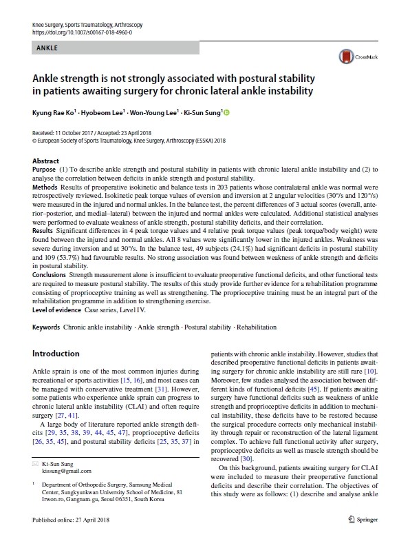 텍스트 상자: SCI급 국제학술지 KSSTA, 논문 2편 등재이원영 원장의 연구 논문은 발목 불안정성 환자의 수술적 치료와 재활 치료에 관한 내용으로, 첫 번째 논문 ‘발목 불안정성 수술의 변형 브로스트롬 술기에서 종비인대 재건 유무에 따른 임상 결과 차이’와 두 번째 논문 ‘발목 불안정성 환자의 수술 후 재활에서 자세 안정성을 위한 고유 수용성 감각 재활의 중요성’이 모두 연구의 유의성을 인정받아 해당 학술지에 채택되었다.