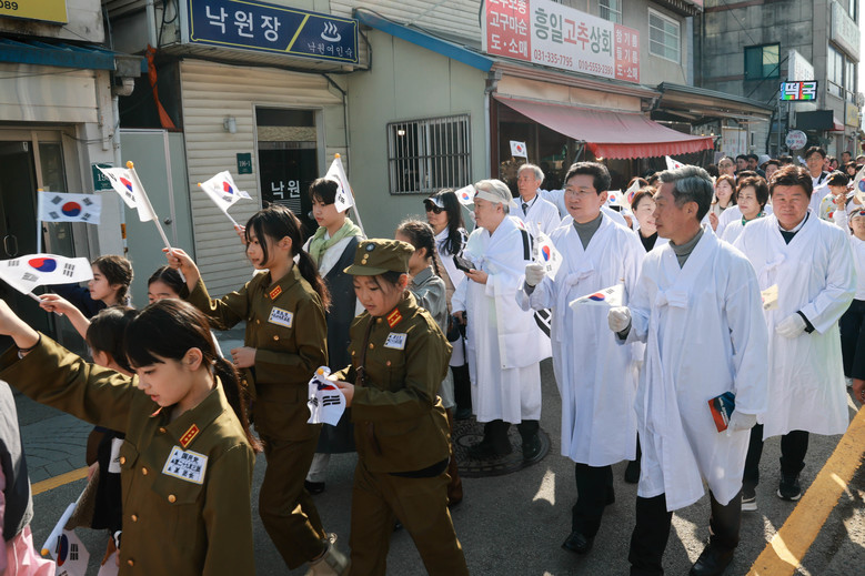 이상일 시장을 비롯한 참석자들은 기념식이 끝난 뒤 취타대를 선두로 용인중앙시장 놀이광장에서 중앙공영주차장까지 만세 행진을 이어가며 당시의 함성을 생생하게 재현했다.