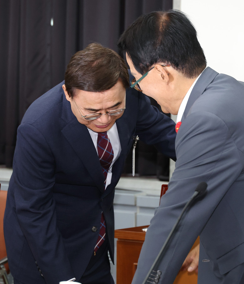 [세계타임즈 = 신상철 기자] 이종석 국가정보원장 후보자(왼쪽)가 19일 오후 서울 여의도 국회 정보위원회에서 대북·안보 관련 질의를 위해 비공개로 진행되는 인사청문회에 입장해 국정원장을 지낸 더불어민주당 박지원 의원과 대화하고 있다. 2025.6.19