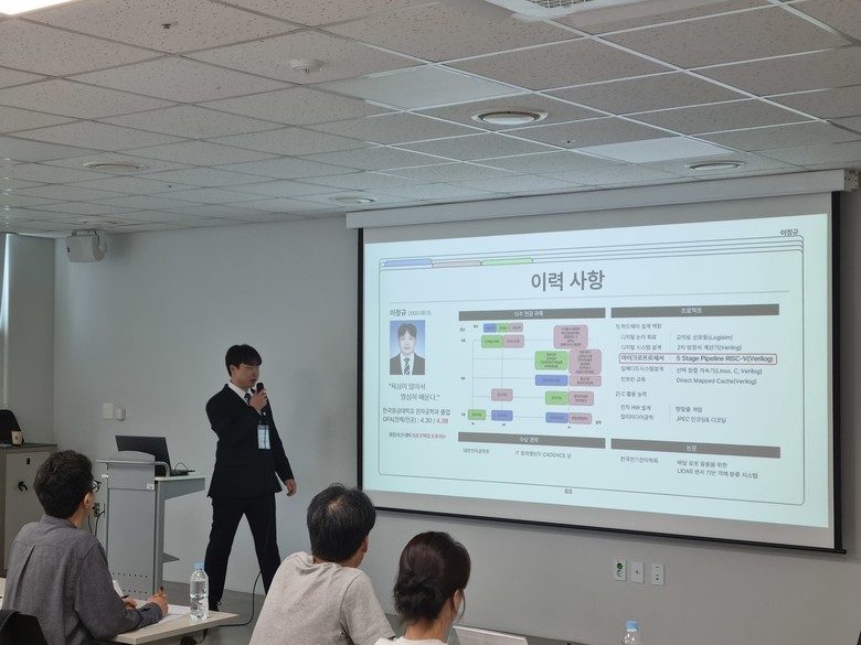 | ▲ AI 반도체 설계 전문 엔지니어 양성과정과 연계한 잡페어에서 교육생이 발표하는 모습 |