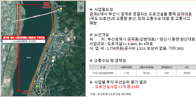 △금곡과선교 회차로 조기 준공, △ 금곡~양산간 시계도로 완성, △화명~만덕 연결도로를 적기 추진해줄 것을 부산시에 당부하였다.