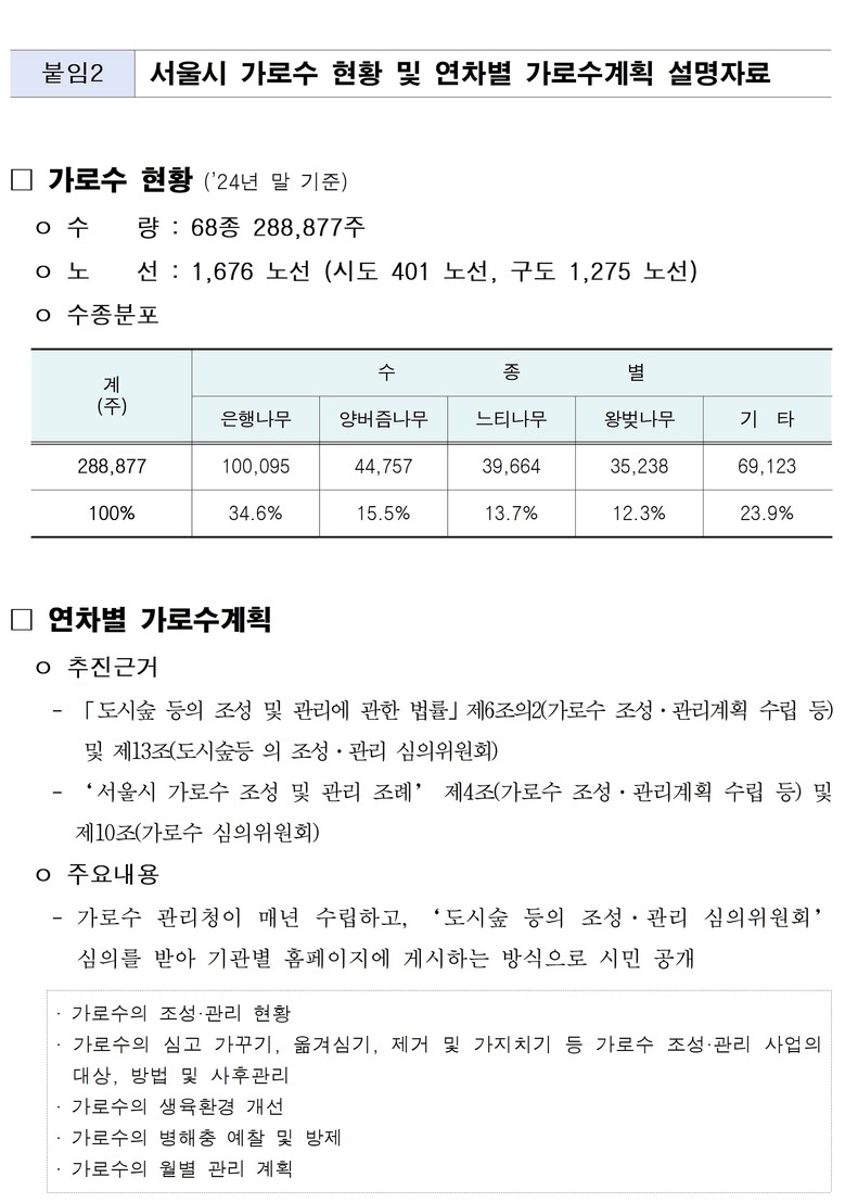 연차별 가로수계획은 2024년 1월에 시행된 「도시숲 등의 조성 및 관리에 관한 법률」 제6조의2 및 “서울시 가로수 조성 및 관리 조례” 제4조의 가로수 조성·관리계획 수립의 규정에 의거한 사항으로, 서울시는 2025년에도 27개 기관의 연차별 가로수계획의 수립 및 공표를 완료한 바 있다.