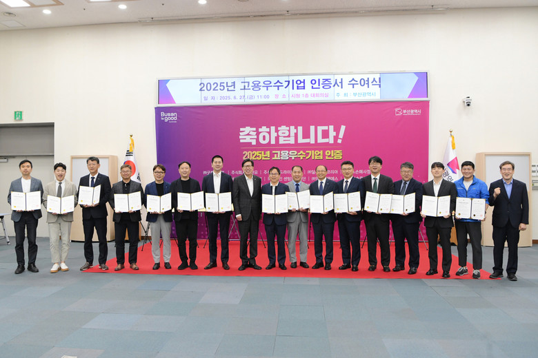 ◈ 6.27. 11:00 시청 대회의실에서 올해 고용우수기업에 대한 인증서 수여식 개최… 박형준 시장, 선정 기업 대표 등 40여 명 참석 [세계타임즈=부산 이용우 기자] 부산시(시장 박형준)와 (재)부산경제진흥원은 고금리, 고물가 등 어려운 경제 상황에서도 일자리 창출을 위해 노력한 15개 사를 '2025년도 고용우수기업'으로 선정했다고 밝혔다.