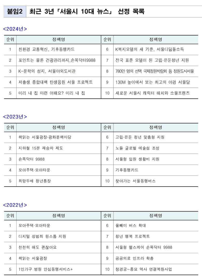 「서울시 10대 뉴스」는 한 해 동안 서울시가 시행한 주요 정책들에 대한 관심을 환기하고, 투표를 통해 정책에 대한 시민들의 목소리를 듣기 위해 매년 실시해 오고 있다
