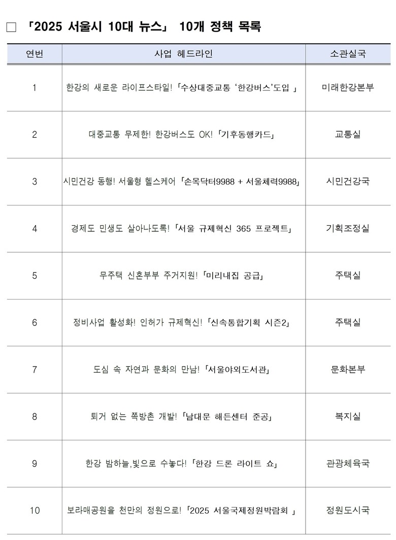 - 한강버스, 규제혁신, 신통기획, 기후동행카드 등 10개 정책 후보로 뽑혀