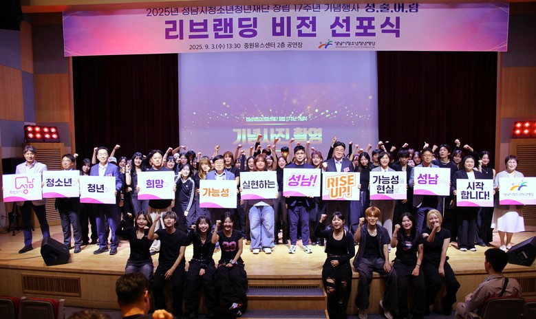 | ▲재단 창립 17주년 기념행사 퍼포먼스 기념촬영.(사진=성남시청소년청년재단) |