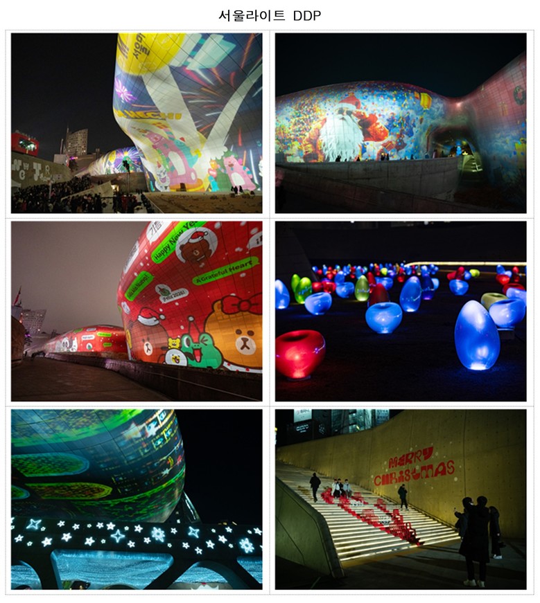 ○ (DDP) ‘서울라이트 DDP’에서는 귀여운 캐릭터와 크리스마스 오브제를 압도적인 미디어아트로 선보이며 관람객들의 시선을 사로잡는다. 특히 어울림광장~팔거리~잔디언덕을 잇는 거대한 크리스마스 타운은 외국인 관광객과 MZ세대의 필수 방문 코스로 자리 잡았다.