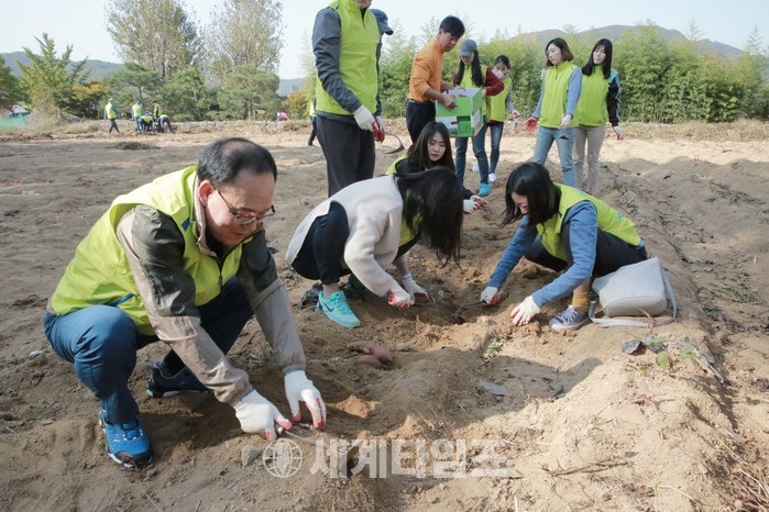 정성환 전략총괄부사장을 비롯한 농협생명 임직원 40여명은 외암마을 주민들을 위해 마을 환경정리와 고구마 수확을 도왔다. 외암마을에서는 이달 20일부터 22일까지 3일간 ‘제18회 외암민속마을 짚풀문화제’가 열렸는데, 축제를 끝낸 마을의 뒷정리에 농협생명이 힘을 보탠 것이다.