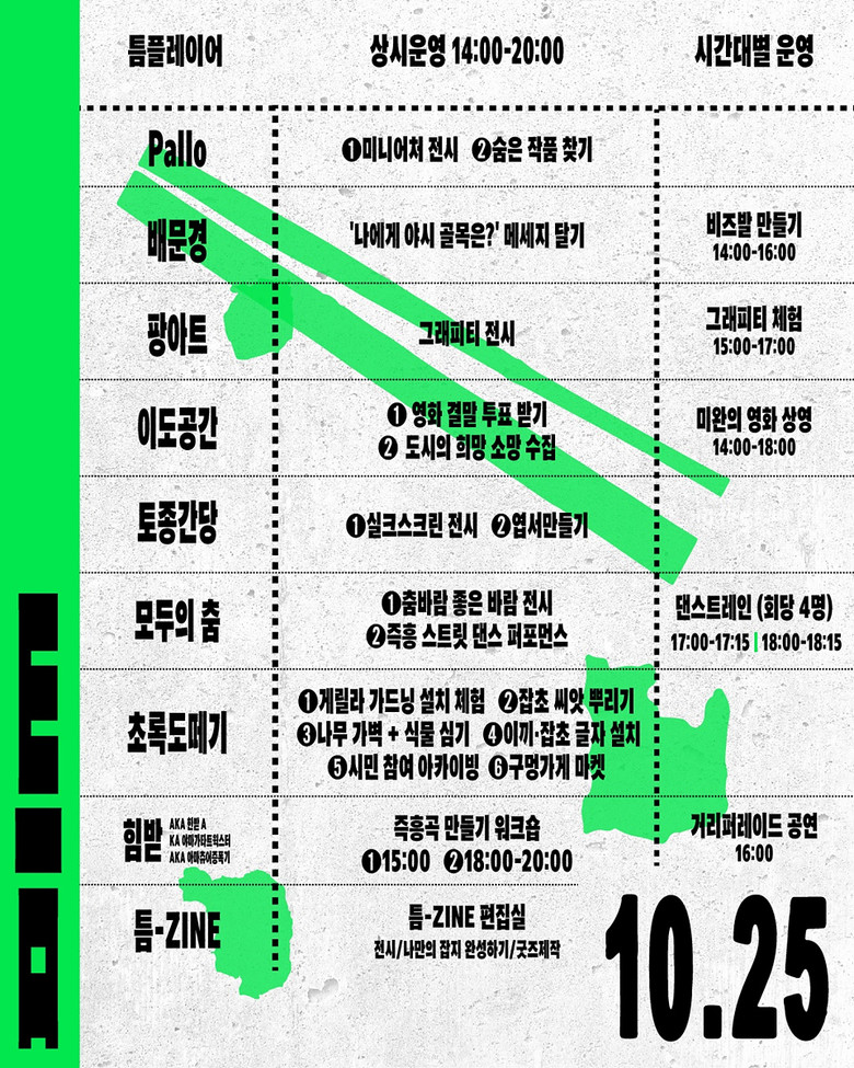 행사를 통해 독특한 상업문화와 청년문화가 공존하는 ‘야시골목’ 일대의 지역적 맥락을 새롭게 해석하고, 도심 속 틈새 공간을 문화 실험장으로 전환하는 것을 목표로 한다.