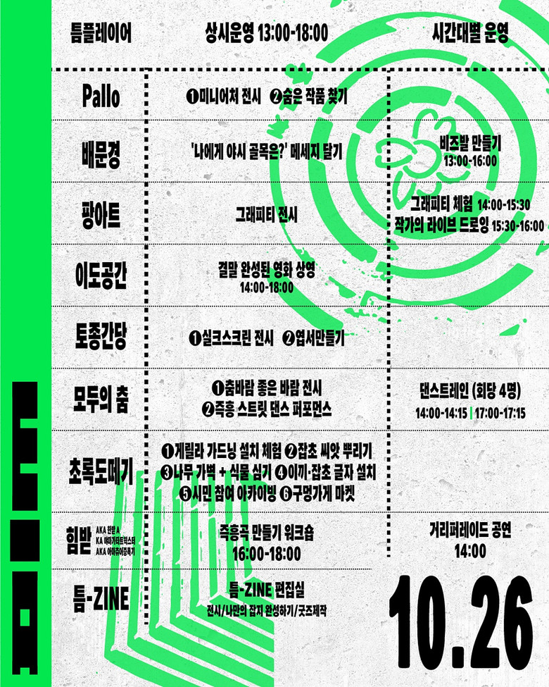 대구를 기반으로 활동하는 미술작가, 거리 예술가, 그래피티 예술가, 댄서, 래퍼, 셀러 등 50여 명이 청년문화의 다양성과 실험정신을 선보인다. 지난 8월부터 진행된 사전 워크숍을 통해 지역 청년들이 직접 기획하고 창작한 ‘거리형 공간실험 콘텐츠’를 시민들과 공유하며, 참여형 프로그램을 통해 도심의 창의적 재활성화와 지역문화의 확산을 이끌 예정이다.