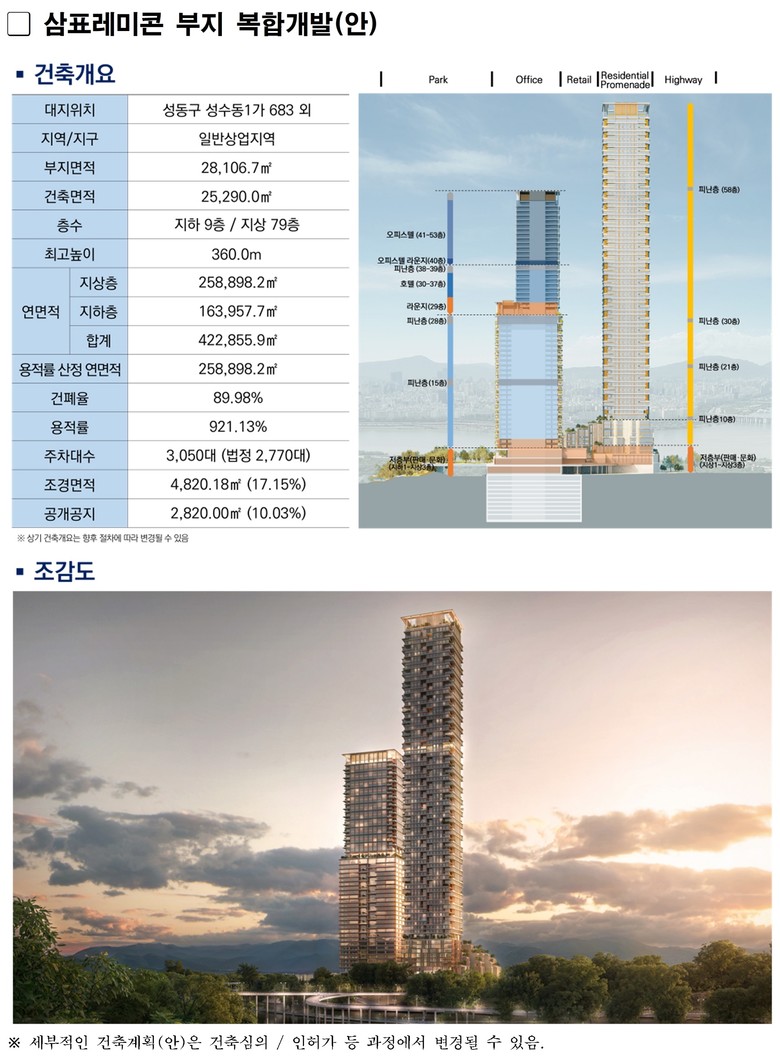 삼표레미콘 부지는 최고 79층 규모의 업무, 주거, 상업기능이 복합된 시설로 조성될 예정이며, 미래업무 중심기능 확보를 위해 업무시설을 35% 이상 확보토록 하였다.