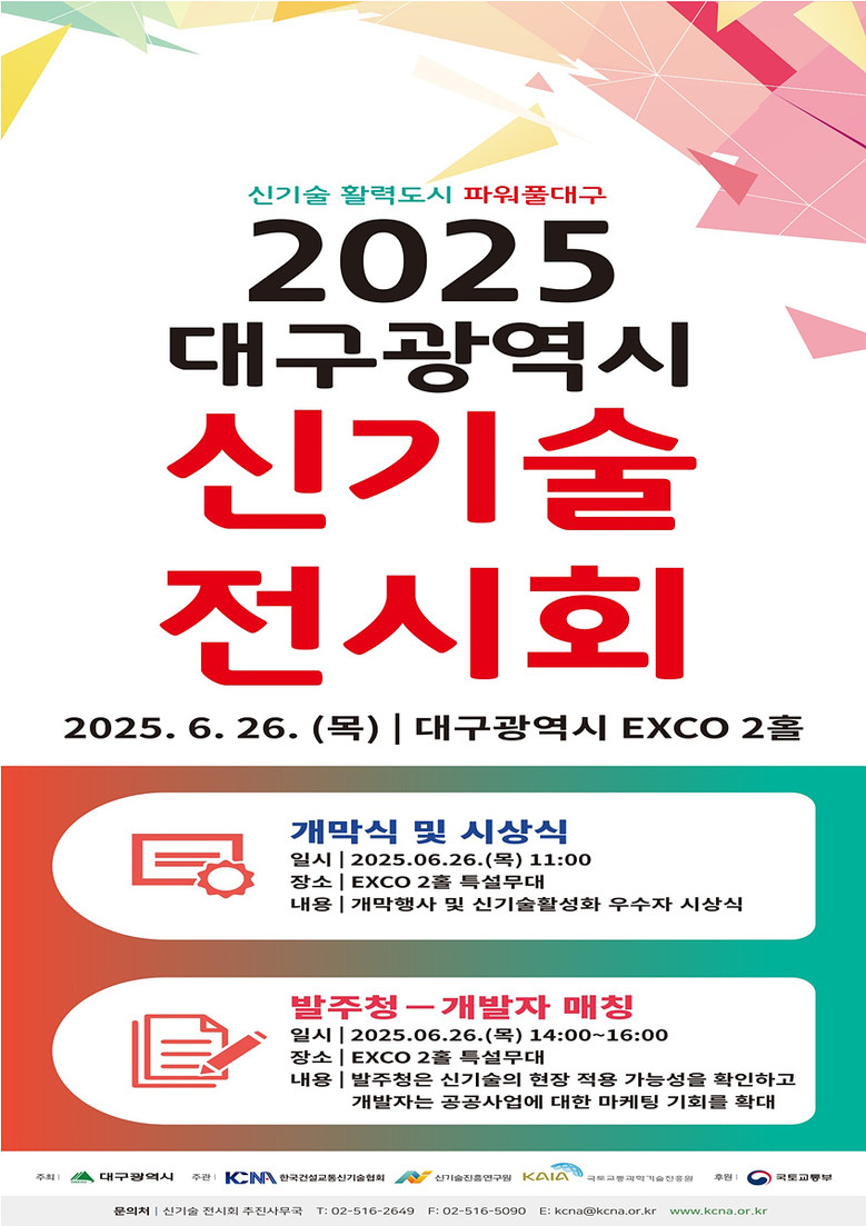 대구광역시가 주최하고 한국건설교통신기술협회, 신기술진흥연구원, 국토교통과학기술진흥원이 공동 주관하는 이번 전시회는 2022년 첫 개최 이후 올해로 네 번째를 맞이하며, 건설·교통 분야 신기술과 대구신기술플랫폼 등록 신기술, 정부 인증 신기술, 혁신제품 등 다양한 기술을 소개, 정보교류와 비즈니스 기회의 장으로 자리 잡았다.