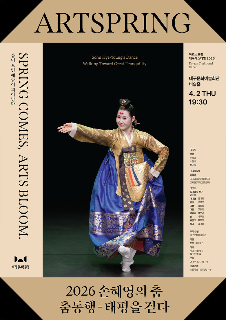 ▸ 정상급 악사들의 연주와 무용수가 교감하며 완성되는 생동감 넘치는 무대 [세계타임즈=대구 한윤석 기자] 대구문화예술진흥원 대구문화예술회관(관장 김희철)은 오는 4월 2일(목) 오후 7시 30분, 대구문화예술회관 비슬홀에서 2026 손혜영의 춤 ‘춤동행, 태평을 걷다’를 개최한다.