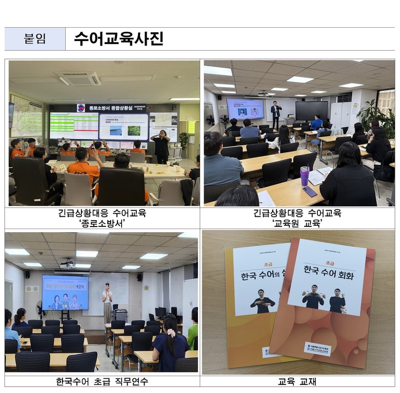 - ‘긴급상황대응 수어교육’ 2시간 과정, 대상자(소방,경찰 등)별로 4가지 교육 준비