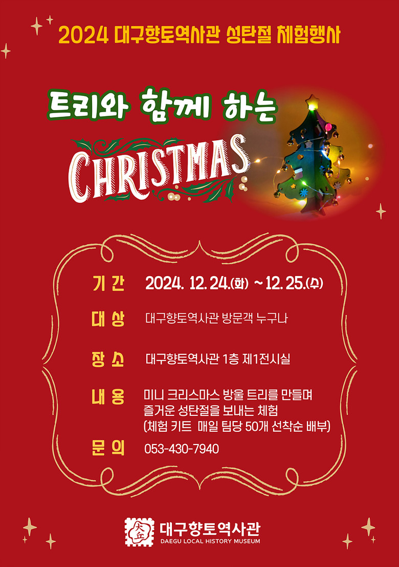 달성공원 대구향토역사관은 12월 24일(화)부터 25일(수) 이틀간 ‘트리와 함께 하는 크리스마스’를 운영하며, 팔공산 대구방짜유기박물관은 24일(화)부터 26일(목)까지 3일간 ‘2024 대구방짜유기박물관과 함께하는 행복한 크리스마스’를 운영한다.