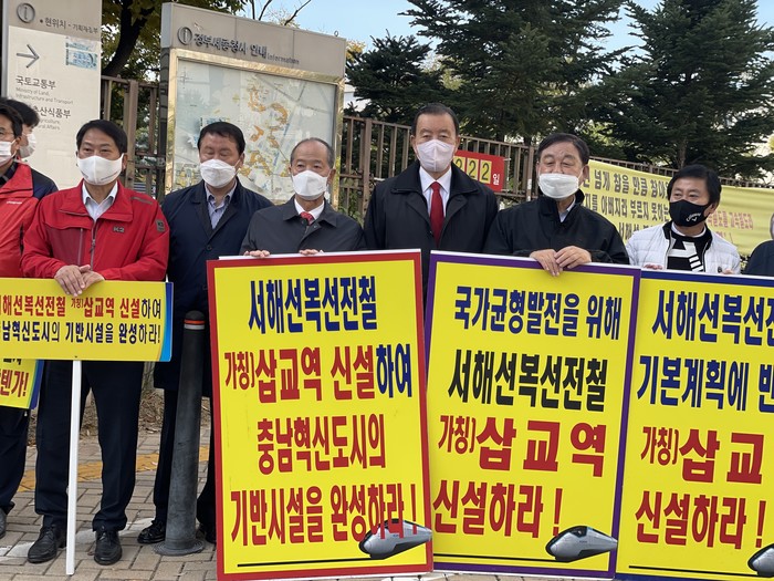 한편 홍문표 의원은 지난 9월15일 정기국회 대정부질문자로 나서 ▲타당성 조사통과 ▲부지매입확보 ▲토지보상완료 ▲국가가 고시하고 기본계획에 반영 되는 등 역을 신설할 수 있는 주변 여건을 다 갖추고 있는데도 정부가 추진을 미루고 있는 것은 충남 홀대이자 야당지역 국회의원 홀대라고 비판하면서 삽교역 신설 관철에 대한 강한 의지를 피력했었다.