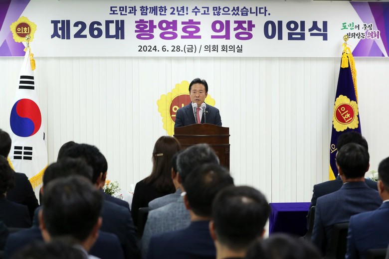 황 의장은 이임사에서 “대과 없이 의장직을 마무리할 수 있도록 도와주신 모든 분들께 진심으로 깊은 감사를 드린다”며 “여‧야간 협치와 소통을 바탕으로 집행부에 대한 견제 감시라는 의회 본연의 역할에 충실하면서 도민이 부여한 의회의 역할과 존재 이유를 실천하는 데 최선을 다했다”고 회고했다.