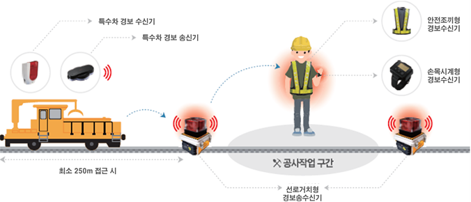 열차접근 경보장치는 특수차가 접근할 경우 작업자의 조끼·손목시계 등 4종 수신 알림장치로 즉시 경보음을 송출하는 방식으로 작동한다. 시·청각 기반 알림시스템 도입을 통해 작업자가 대피할 수 있는 ‘골든타임’을 확보할 수 있게 됐다.