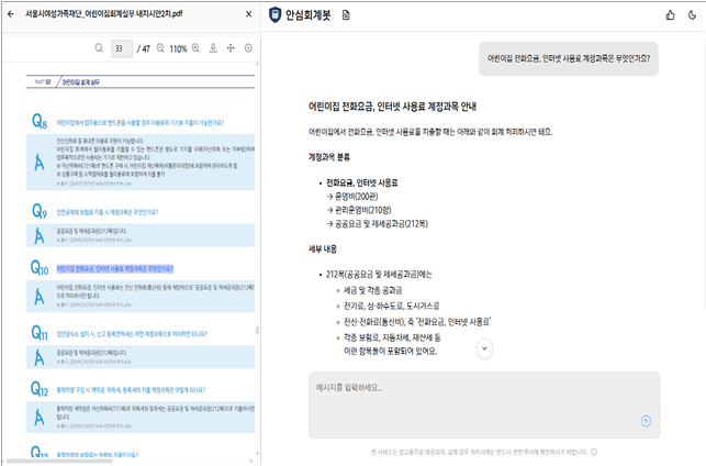 AI 안심회계봇은 RAG(검색 증강 생성) 기술을 활용해 어린이집 회계 매뉴얼과 지침을 근거로 답변을 생성함으로써, AI가 임의로 응답하지 않고 공식 문서에 기반한 신뢰할 수 있는 정보를 제공한다.