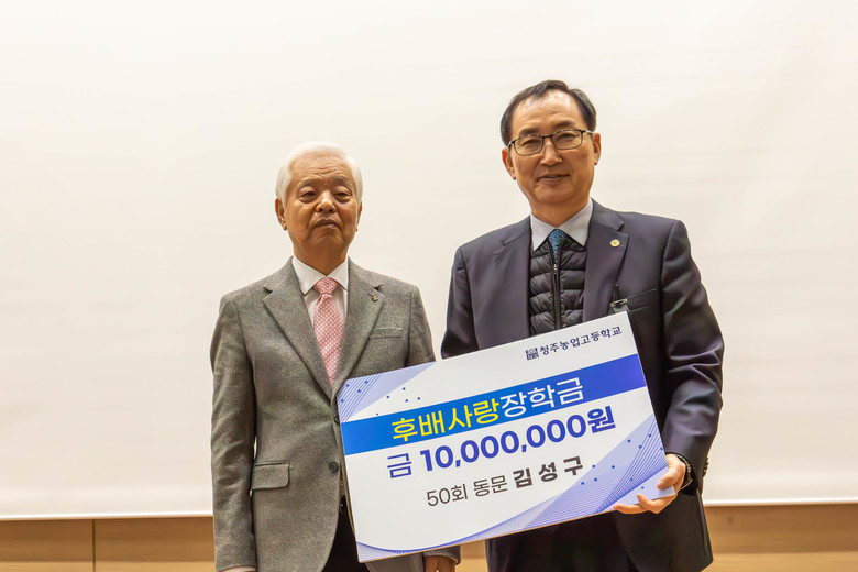 고종현 청주농업고등학교장은 “후배들을 위해 큰 결심을 해주신 김성구씨께 감사드린다.”며, “기탁해 주신 장학금은 어려운 환경에서도 꿈을 향해 나아가는 학생들에게 큰 힘이 될 것이다.”라고 말했다.