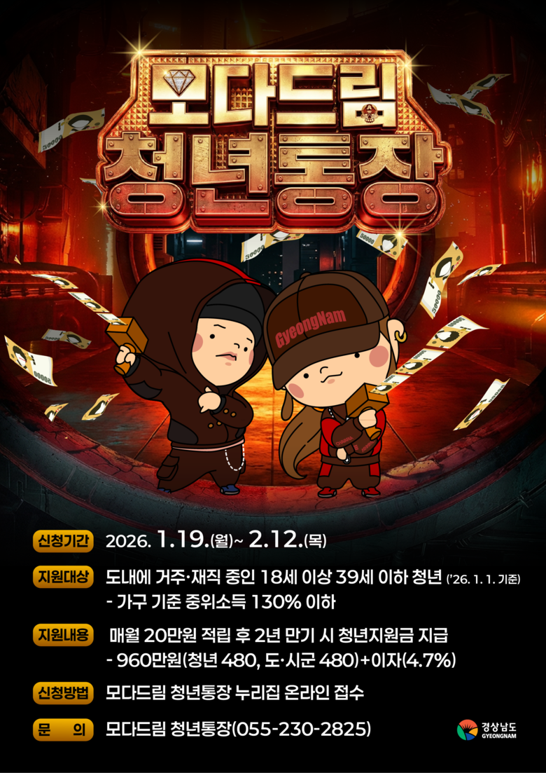 [세계타임즈=경남 최성룡 기자] 경상남도(도지사 박완수)와 경남투자경제진흥원(원장 오재호)은 청년의 자산 형성과 지역 정착을 돕는 ‘모다드림 청년통장’ 상반기 참여자를 이번 달 19일부터 2월 12일까지 모집한다고 밝혔다.