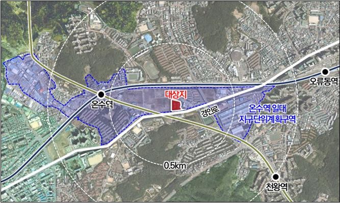 대상지는 1·7호선 온수역에서 도보 10분 거리에 위치하며, 간선도로인 경인로와 인접해 교통 접근성이 우수하다. 주변에서 다양한 개발사업이 진행 중으로, 향후 쾌적한 주거환경이 조성될 것으로 기대되는 지역이다.