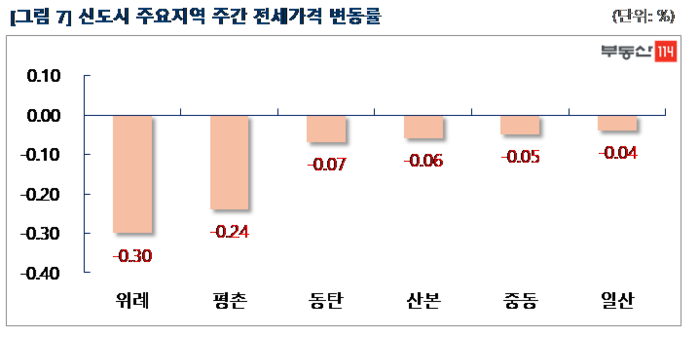 신도시는 ▼위례(-0.30%) ▼평촌(-0.24%) ▼동탄(-0.07%) ▼산본(-0.06%) ▼중동(-0.05%) ▼일산(-0.04%) 순으로 하락했다. 위례는 위례신도시송파푸르지오와 위례롯데캐슬, 평촌은 호계동 무궁화경남, 샘대우한양, 목련우성7단지, 동탄은 반월동 신동탄SK뷰파크와 동탄2신도시대원칸타빌포레지움 등이 500만원-1,000만원 떨어졌다.